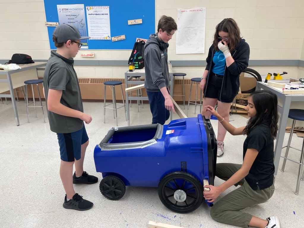 On Monday June 19th, our team for the Hack the House Challenge was joined by Katelyn from Beakerhead in the Makerspace to share our design and progress. Our team of grade 9 students is the youngest in the challenge and we are looking forward to seeing how we stack up against the teams from the University of Calgary.