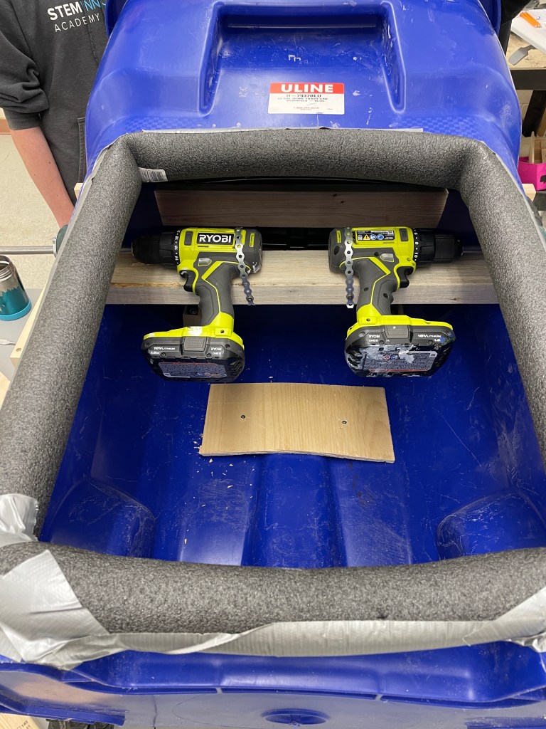 The team of grade 9 students began working on the challenge when it was announced in May. We spent many lunch hours turning the blue recycling bin into a cordless drill powered vehicle recharged through a solar panel and power station generously funded through the Beakerhead Hack the House grant.