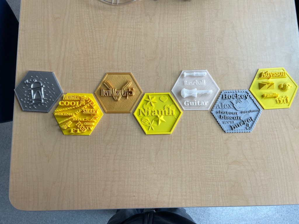 Our grade 7 “Introduction to Content Creation” option course has been busy designing Hextiles in Tinker Cad that represent each student’s passions and interests. Once the students were satisfied with their 3D model in the CAD software, they learned how to “slice” their models to prepare them for 3D printing.
