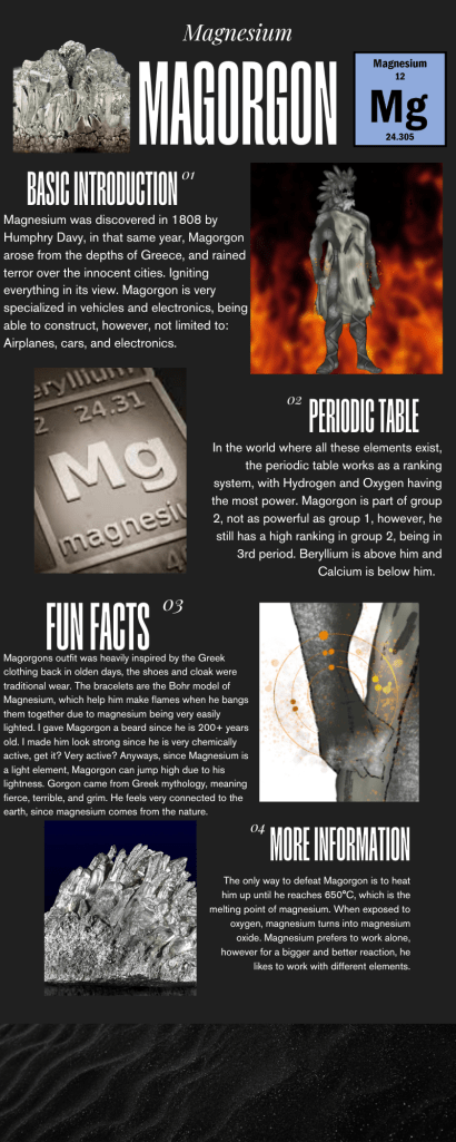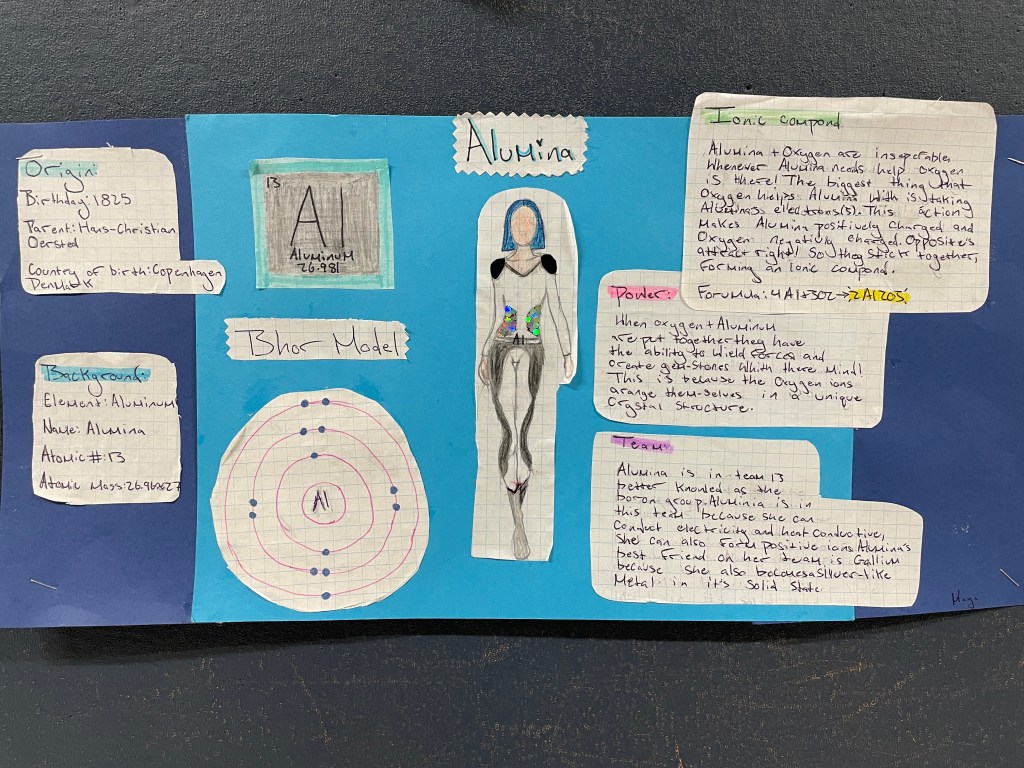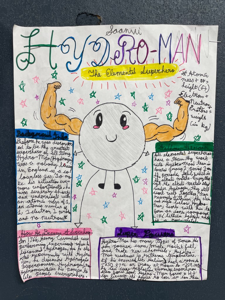 After learning all about the periodic table, chemical and physical properties of elements and compounds, and atomic structure, our Grade 9 students were tasked with creating an elemental superhero. Using their knowledge of one specific element, they were tasked with creating a superhero or villain that encompassed its elements properties and its location on the periodic table. They were expected to apply their knowledge creatively and with reasoning. Furthermore, they were expected to explain what other superhero or element their creation would work with based on ionic compounds and ions formed. See some great creations below!