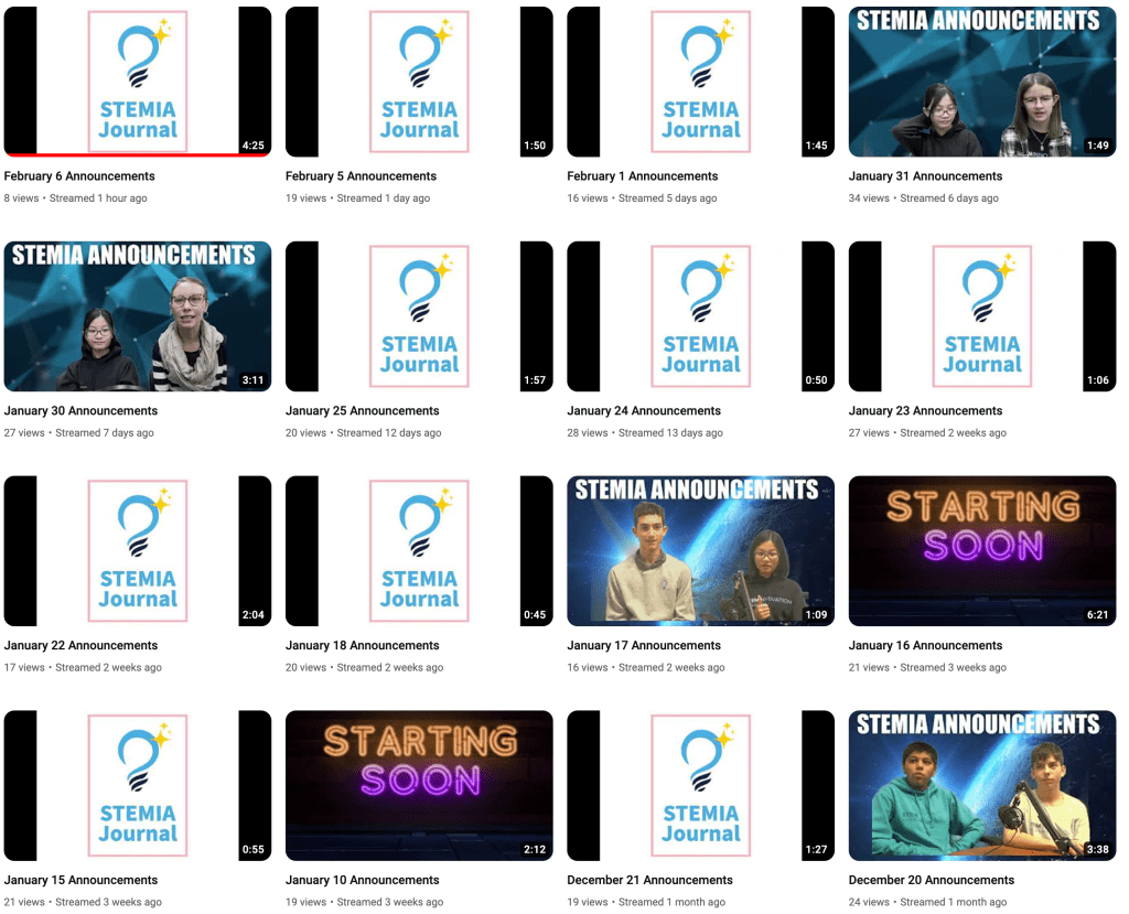 This school year, our junior high has been prototyping Video Announcements, sharing school events, student birthdays, and a daily joke. The co-anchors for the announcements are student council members who work with Ms. Gillie, Ms. Ochitwa, and Mr. Wood. The daily announcements are ‘Live’ every morning during our homeroom standup class. Each announcement is also archived on our STEMIA Journal YouTube channel for students and families who may have missed the live event.