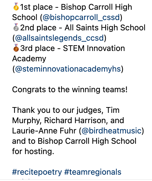 On March 14th, three of our grade 9 students had an opportunity to represent STEM IA Junior High in the annual Team Regionals competition for live poetry performance along with their coach, Mr. Acheson at Bishop Carroll High School.