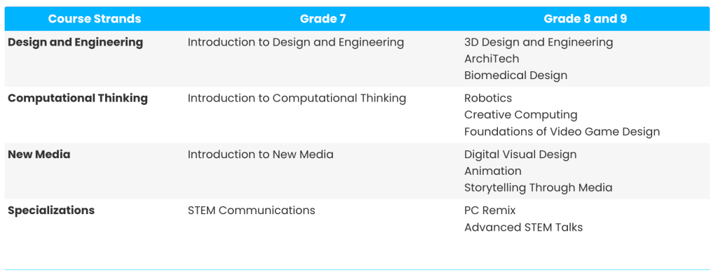 STEM IA junior high option courses are organized into four course strands; specific course offerings will continually evolve. In grade 7, all students take the same four option courses. In these courses, they have the opportunity to sample all three strands while they build important skills and knowledge. In addition, this year we will be offering optional math support classes to complement our regular math programming.