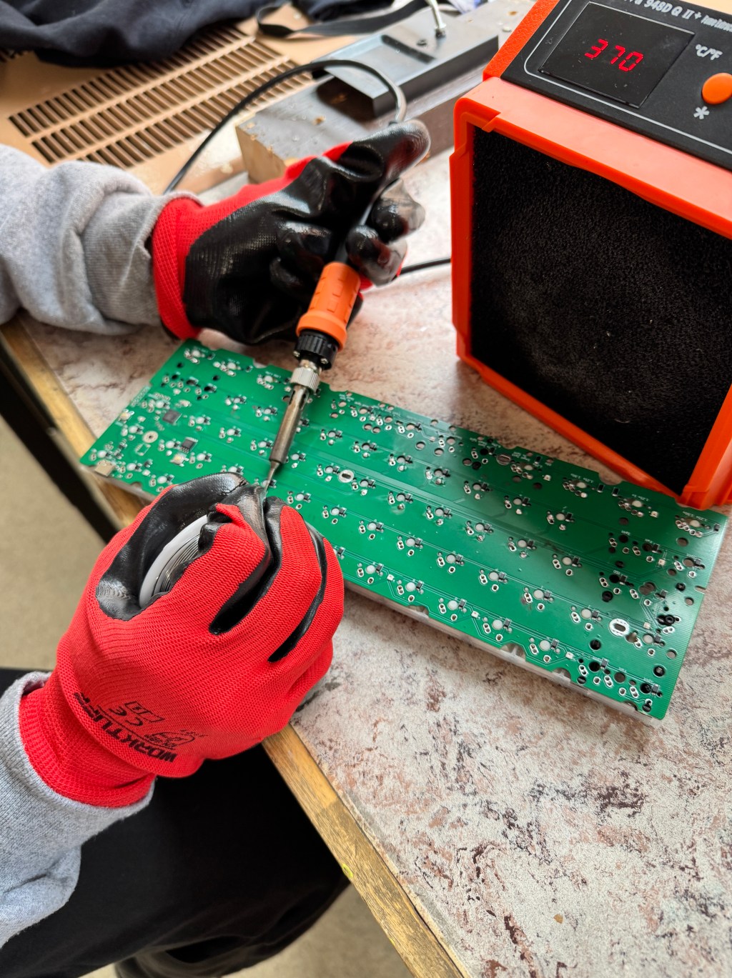 In the PC Remix option, students have been learning the fundamentals of soldering and applying these skills to our hands-on project—building their own mechanical keyboards. They’re currently soldering switches onto PCB boards, creating custom layouts to their preference. The next step involves assembling their keyboards by placing the soldered boards into 3D-printed cases, which were produced at the school. This project allows students to experience the full process of designing and assembling a functional, personalized keyboard.