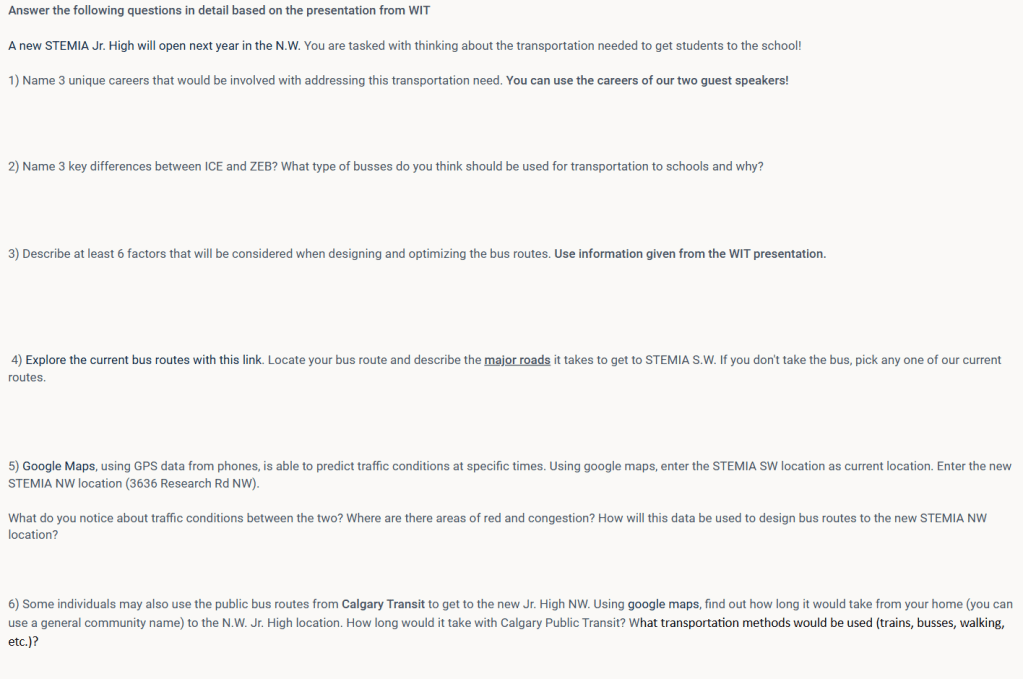 On Monday, October 28th, an Engineering Business Strategist and Transit Planner from the Women in Transit Committee presented to the Grade 9 students about Zero Emission Buses (ZEBs), service design, and route optimization. This presentation served as an introduction to our Environmental Chemistry unit, where students will investigate energy transformations and the Alberta Power Grid. It was an excellent opportunity for students to see how scientific knowledge and data shape real-life projects—such as those implemented by Calgary Transit. They learned about the technologies behind ZEBs and explored various unique careers in STEM and opportunities available for students. Many students were especially engaged, knowing they’ll soon be using Calgary Transit in high school.