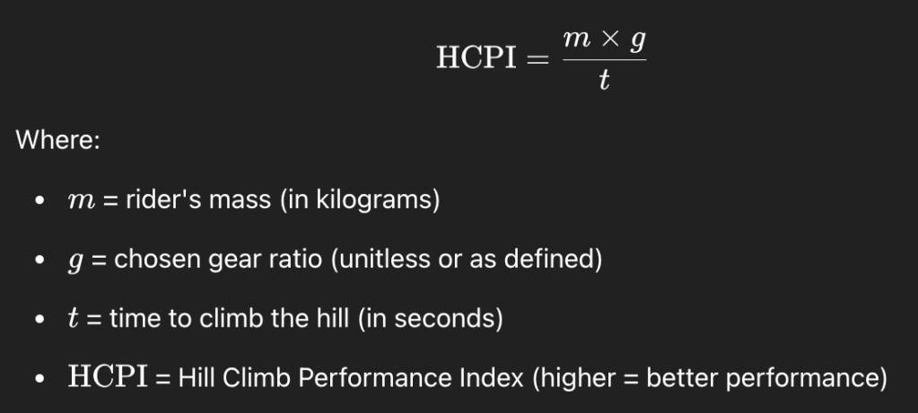 Students were given a variety of measurements from different bicycles and asked to calculate gear and speed ratios for various wheel and gear sizes. We also introduced a Hill Climb Performance Index (HCPI), a new way to measure success in the race in addition to recording the fastest time. The HCPI is calculated by multiplying a rider’s mass by their chosen gear ratio, then dividing by the time it takes to climb the hill. Students have discovered that the fastest rider won’t necessarily have the highest HCPI!
