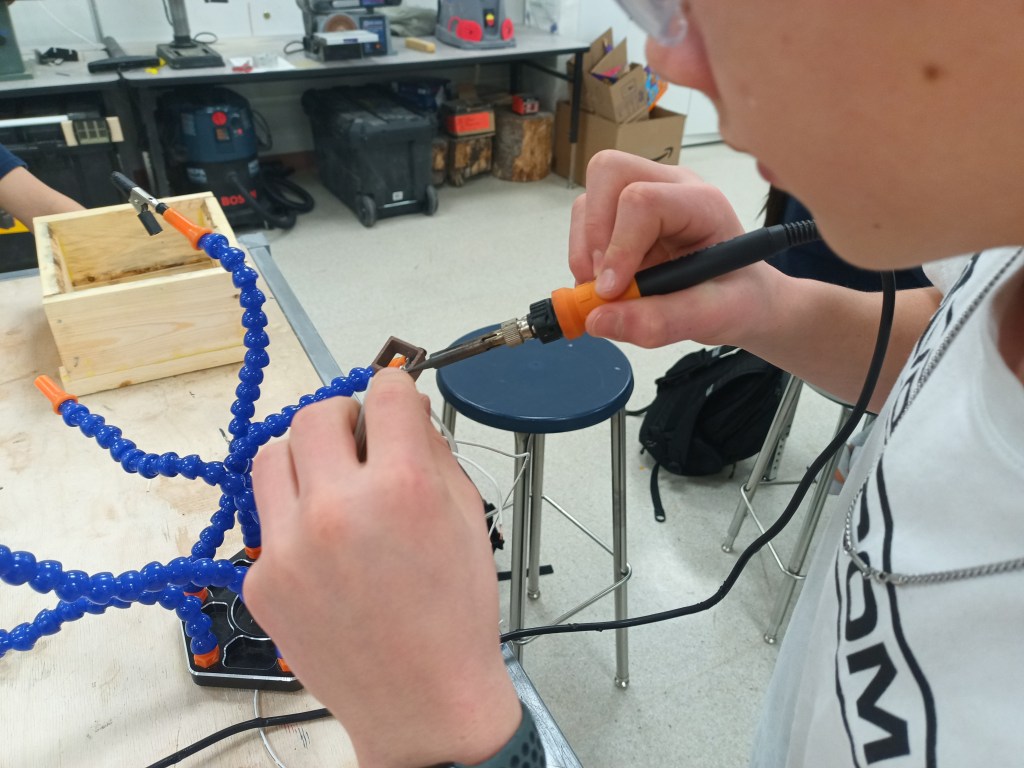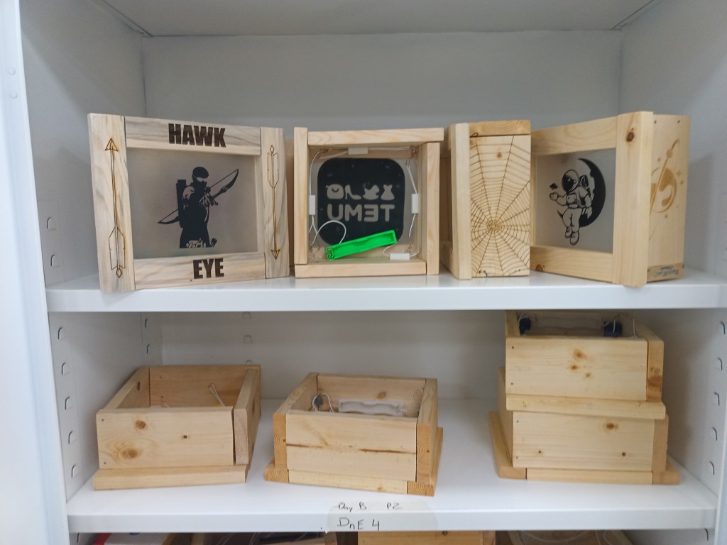 The final phase involved wiring an LED circuit to backlight their designs. Students learned how to solder, calculate resistance for different LEDs in a 3-volt circuit, and assemble the components safely and correctly. The project brought together a wide range of skills, including design, vinyl cutting and application, 3D modelling and printing, woodworking, soldering, and circuitry.