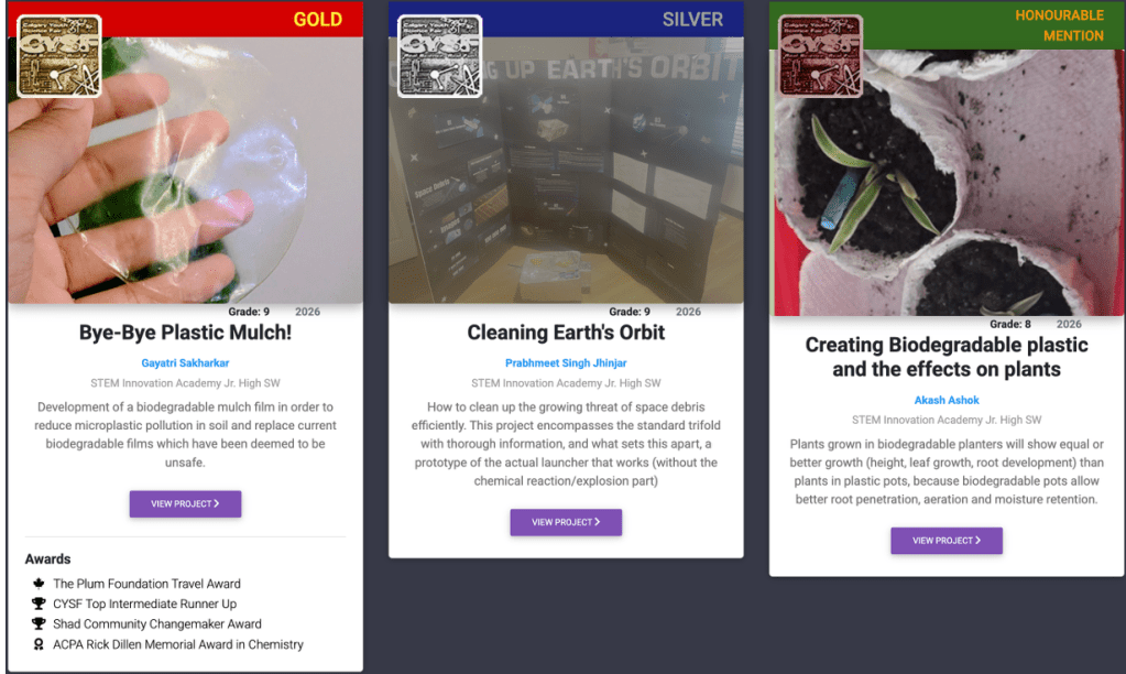 STEM IA SWJH had an outstanding showing at the Calgary Youth Science Fair on April 9, 2026. Nearly 800 students from grades 5-12 participated in event hosted at the University of Calgary. Congratulations to all participants for their hard work and achievements! Thank you to our dedicated parents and teachers for your continued support in helping our students shine! We are pleased to share the official results: